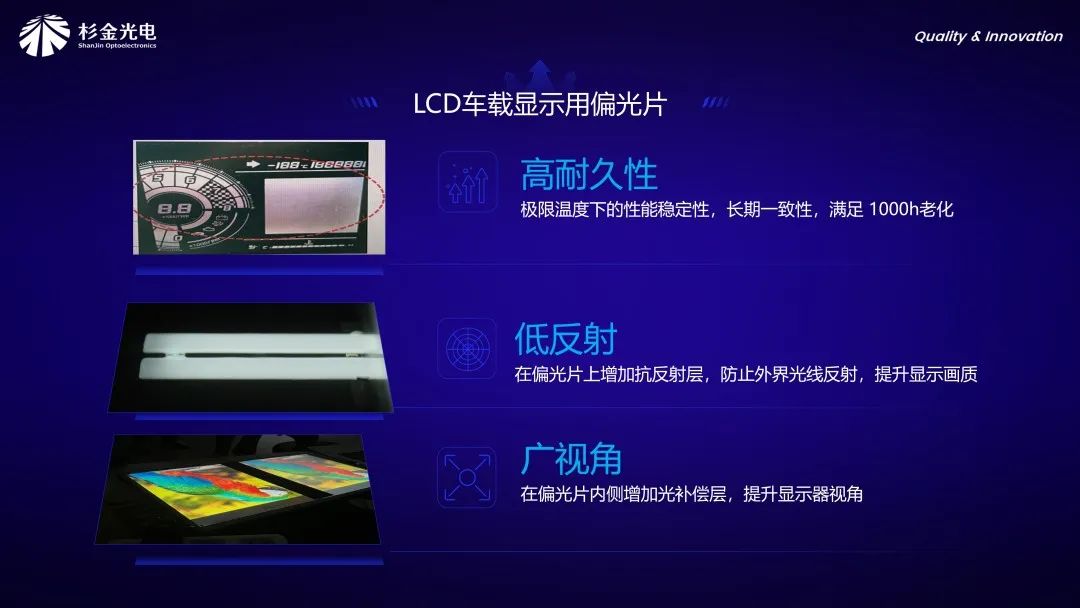 為提升駕駛安全性,車載顯示屏的清晰度規(guī)格日益嚴(yán)格,以確保駕駛員可從更廣的視角觀看屏幕,而非僅從正面觀看。這就需要車載顯示用偏光片滿足高對比度和廣視角的要求。針對車載偏光片更高的性能要求,杉金光電開發(fā)了兩大類產(chǎn)品。