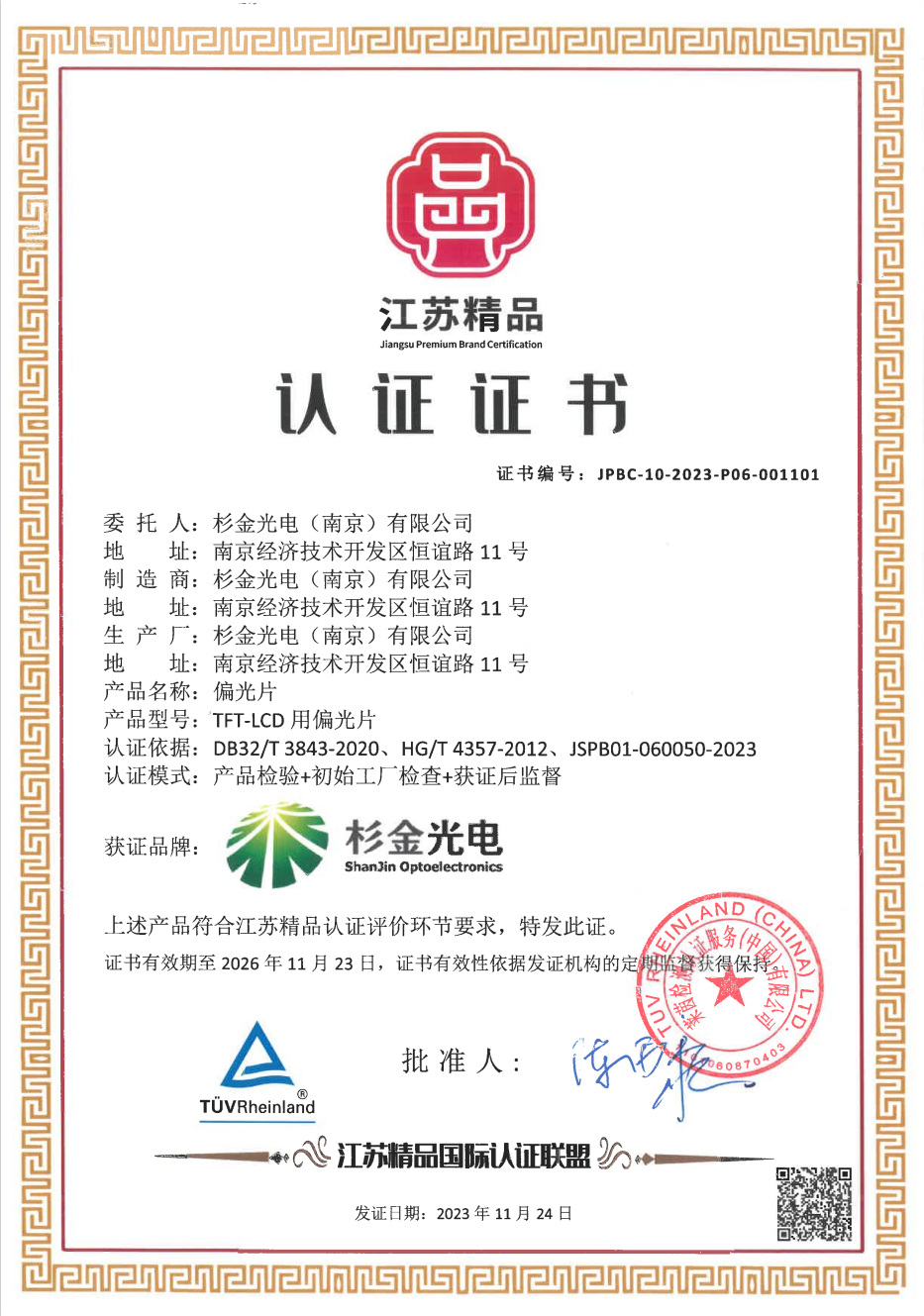 杉金光電自成立以來,一直致力于偏光片技術(shù)的研發(fā)和創(chuàng)新,憑借強(qiáng)大的技術(shù)實(shí)力和嚴(yán)格的質(zhì)量管理體系,為眾多客戶提供高品質(zhì)的產(chǎn)品和服務(wù)。此次榮獲“江蘇精品”認(rèn)證,不僅是對杉金光電過去努力的認(rèn)可,更是對公司未來發(fā)展的極大鼓舞。