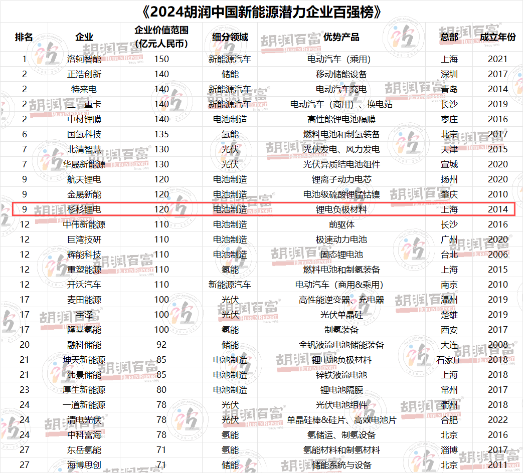 7月26日,胡潤研究院發(fā)布《2024胡潤中國新材料企業(yè)百強(qiáng)榜》及《2024胡潤中國新能源潛力企業(yè)百強(qiáng)榜》。杉杉股份以第28位登上《2024胡潤中國新材料企業(yè)百強(qiáng)榜》,杉杉鋰電以第9位登上《2024胡潤中國新能源潛力企業(yè)百強(qiáng)榜》。
