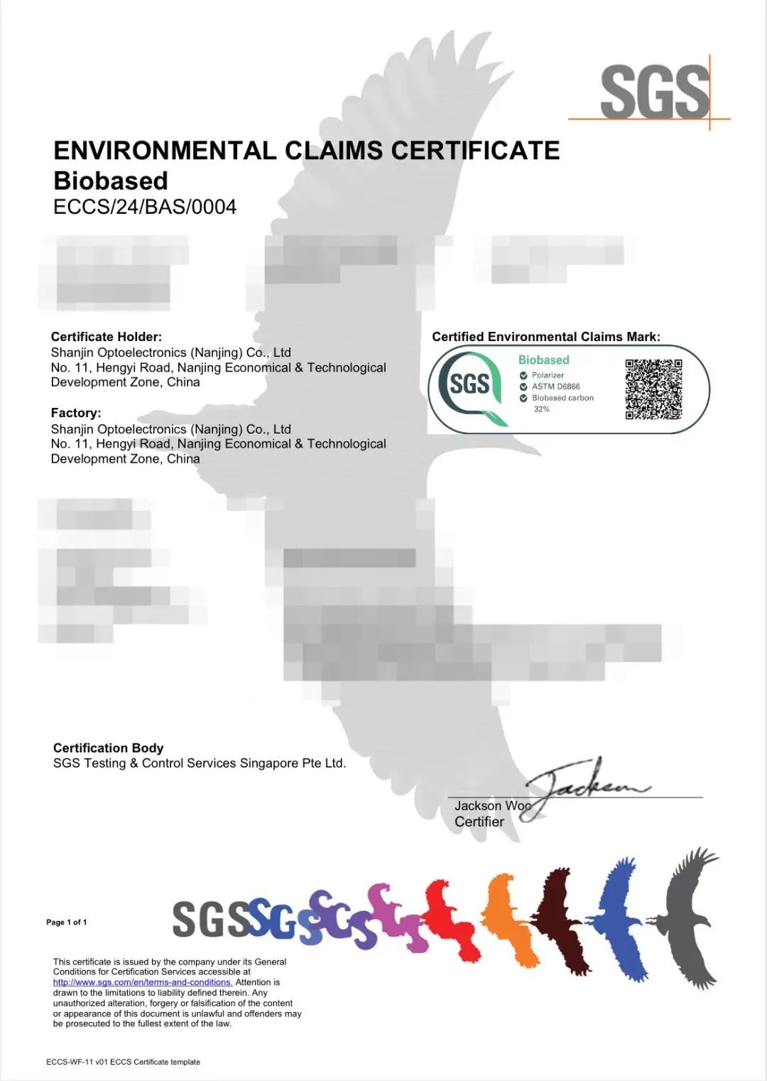 杉金光電始終把綠色理念貫穿于產(chǎn)品研發(fā)、生產(chǎn)和銷售的各個(gè)環(huán)節(jié)。此次,公司自主研發(fā)的“Eco-Friendly Polarizer”產(chǎn)品憑借其高達(dá)32%的生物基碳含量,在環(huán)保領(lǐng)域取得了重大突破。這一創(chuàng)新產(chǎn)品的推出,不僅滿足了市場對綠色環(huán)保產(chǎn)品的迫切需求,也增強(qiáng)了公司對ESG的承諾和在綠色產(chǎn)品開發(fā)領(lǐng)域的領(lǐng)先地位。
